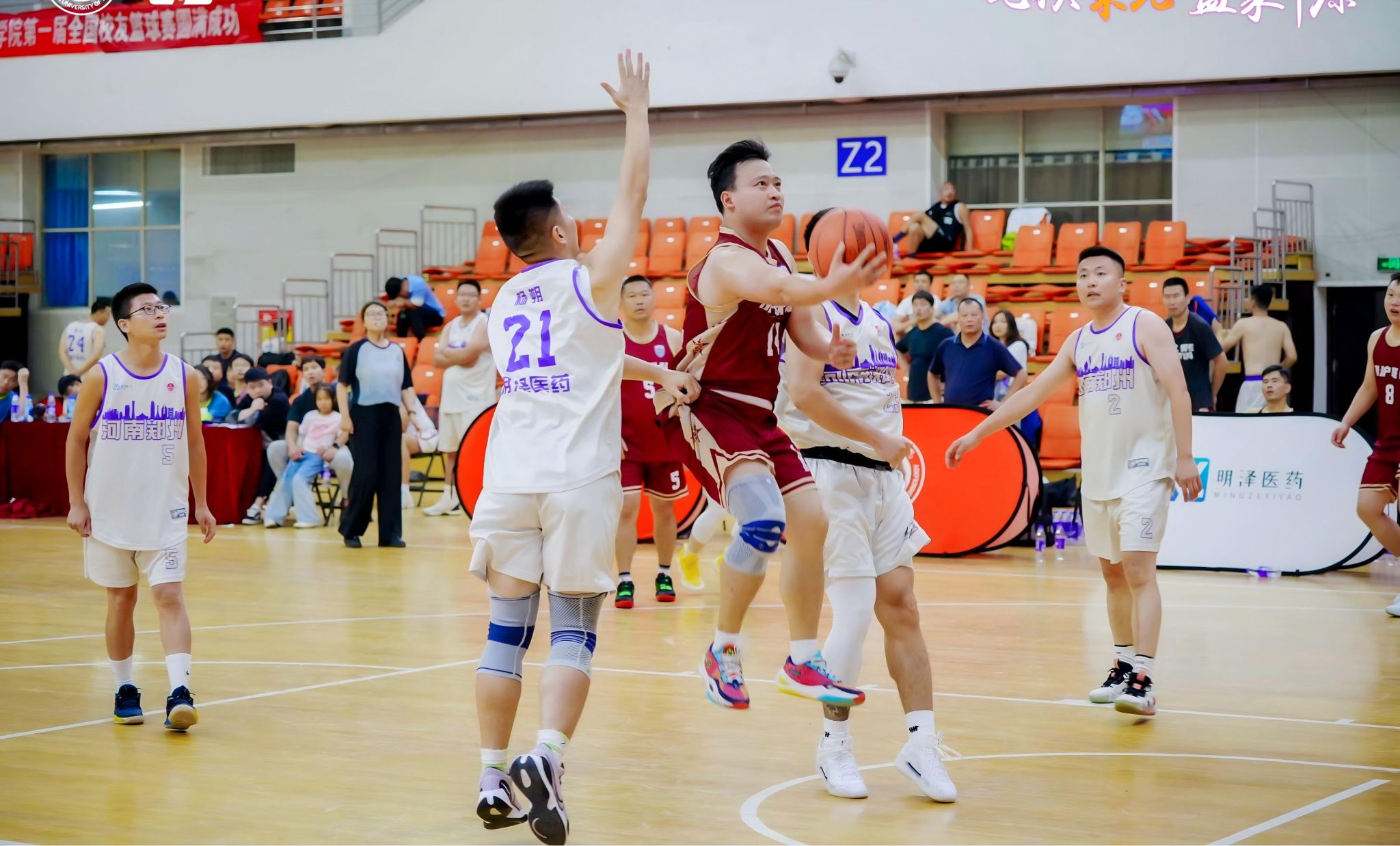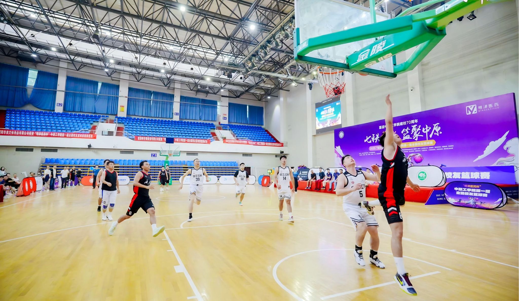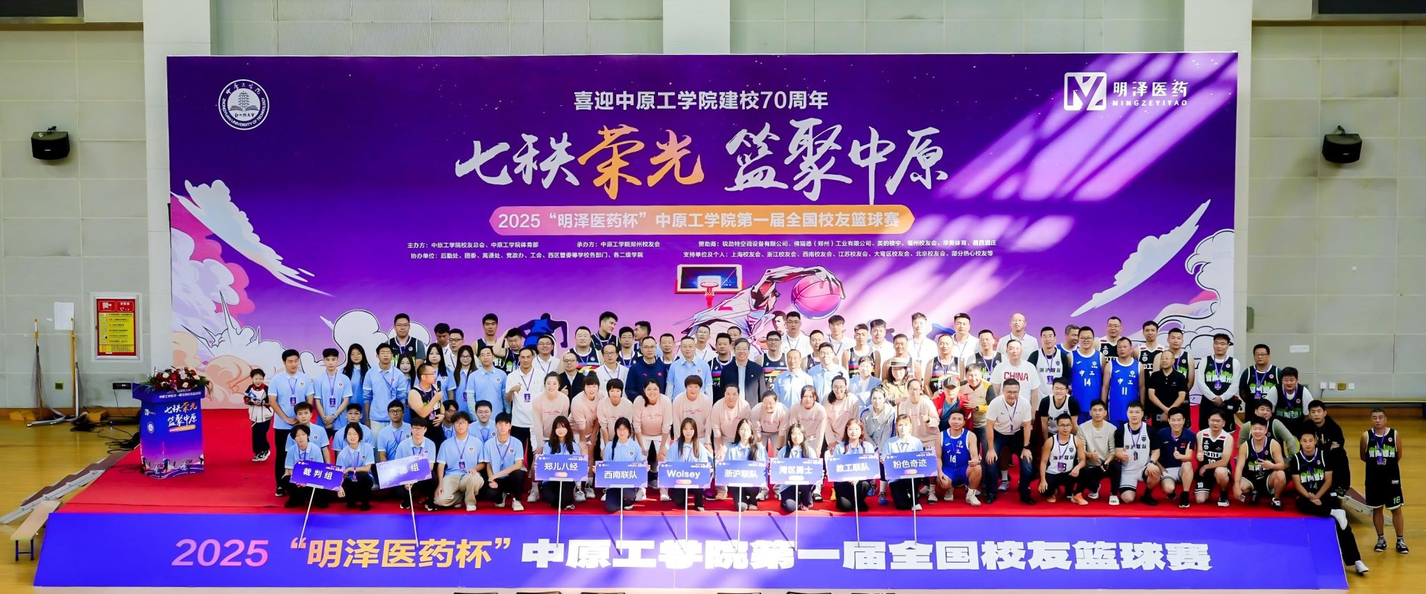 七秩荣光,篮聚中原,本届校友篮球赛由郑州校友会承办,明泽医药、佛锐德、锐劲特、濮阳华奥文体用品、鼎昌酒庄等校友企业为此次比赛提供全程赞助。