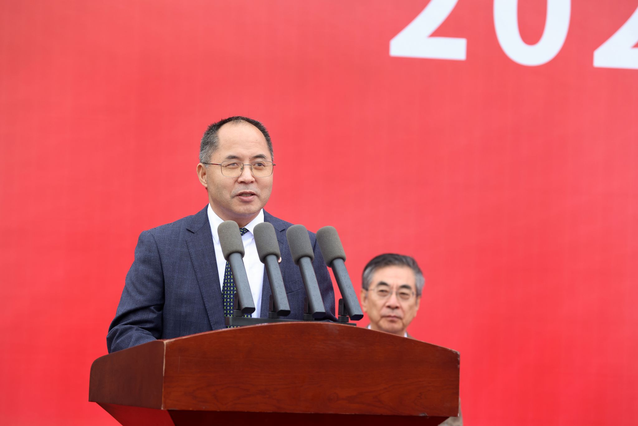 夏元清讲话,代表学校党委和行政以及全体教职员工对新同学表示热烈欢迎,并向辛勤付出的家长、老师、亲友以及承训部队官兵致以诚挚谢意。他以“以奋斗之我 擘画青春华章”开宗明义,回顾学校70年来从服务新中国纺织工业起步,到今天在电子信息、人工智能等前沿领域深耕不辍的办学历程和办学成就,并结合当前发展形势,对全体新生提出四点期望:一是铭记历史、砥砺初心,厚植家国情怀。希望同学们从抗战精神和学校服务国家的传统中汲取力量,将“小我”融入民族复兴的“大我”,把爱党爱国之情转化为扎根祖国大地的实际行动。二是传承薪火、勇担使命,锻造硬核本领。鼓励同学们以优秀师生为榜样,勇担创新使命,在攻坚克难中锤炼能力,以扎实本领服务社会、赢得未来。三是脚踏实地、久久为功,践行成长信条。强调成长没有捷径,要从课堂专注、科研实践做起,善用学校多元平台,多向名师名家请教,一步一个脚印夯实成才之基。四是敢为人先、开拓进取,激扬青春锐气。期待同学们既夯实专业基础,更勇于突破思维、挑战未知,在创新实践中展现青春活力,成就卓越人生。