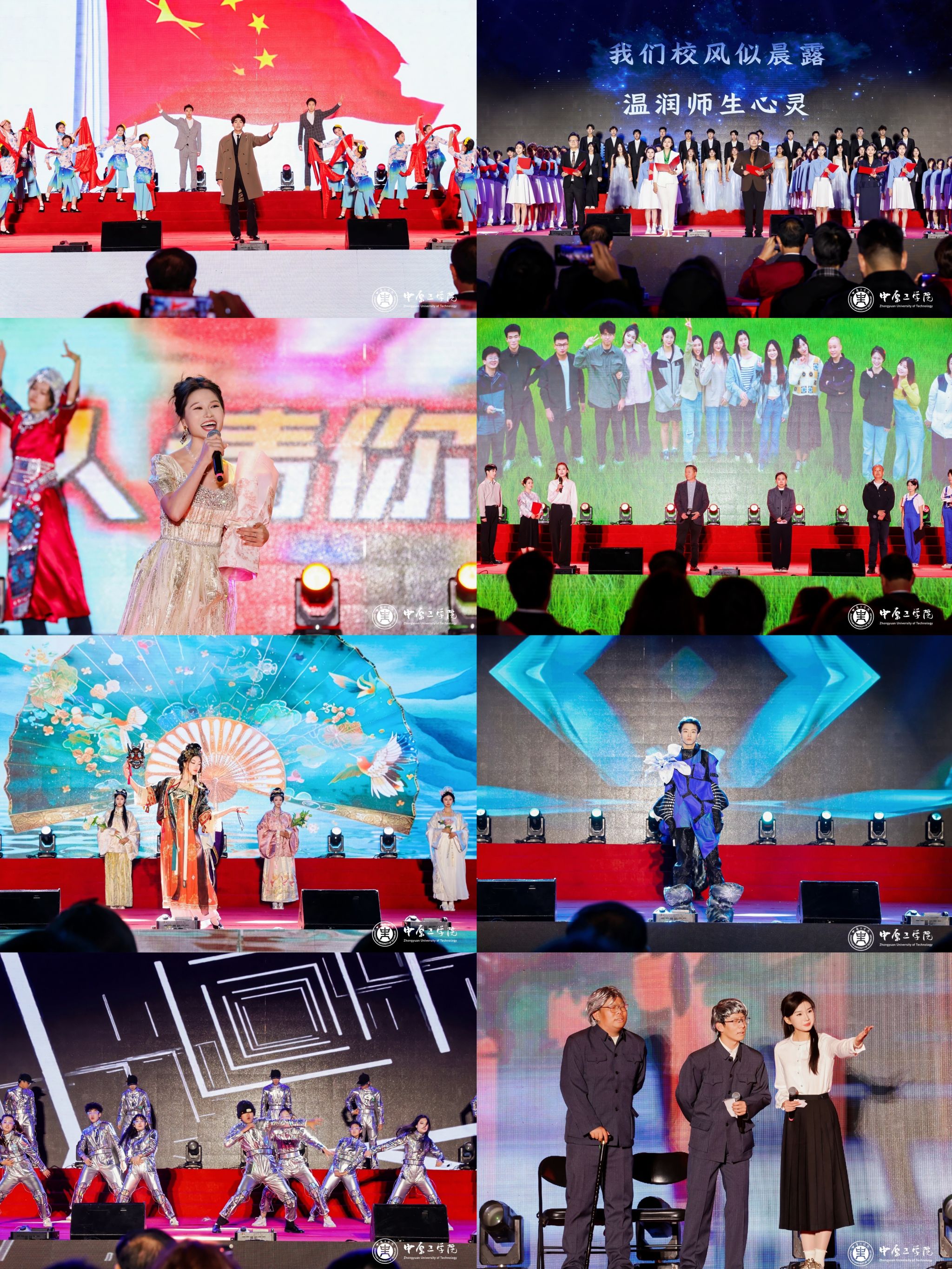 第二篇章“智启新篇”以原创话剧《经纬电光 青春交响曲》开篇,讲述学校在纺织、自动化等特色专业领域的创新发展与学科重塑之路。校友访谈环节中,2007级毕业生、河南卫视新闻主播徐倩分享了深入河南108个县开展新闻报道的感悟;2006级毕业生、河北广播电视台主持人桑桑以一段幽默脱口秀赢得掌声连连。乐队演唱《若月亮没来》《自由飞翔》《我的未来式》等金曲不断掀起高潮,充满文化自信的《麒麟》更引爆全场热情。音诗画情景朗诵《追光70年,逐梦新时代》以三幕史诗画卷,勾勒学校从筚路蓝缕到智创未来的壮阔征程。法学院1998级校友丁时鬲深情献唱《明天会更好》与原创歌曲《母校情》,表达对母校的诚挚祝福。民舞《中原之声》根植黄河非遗文化,舞出中工人投身河南建设的坚定步伐。晚会在教职工百人大合唱《我和我的祖国》《中工颂》中圆满落幕,激昂歌声传递出“博学弘德 自强不息”的校训精神与对祖国深沉的热爱。