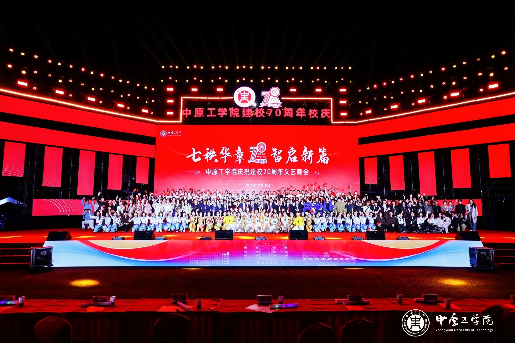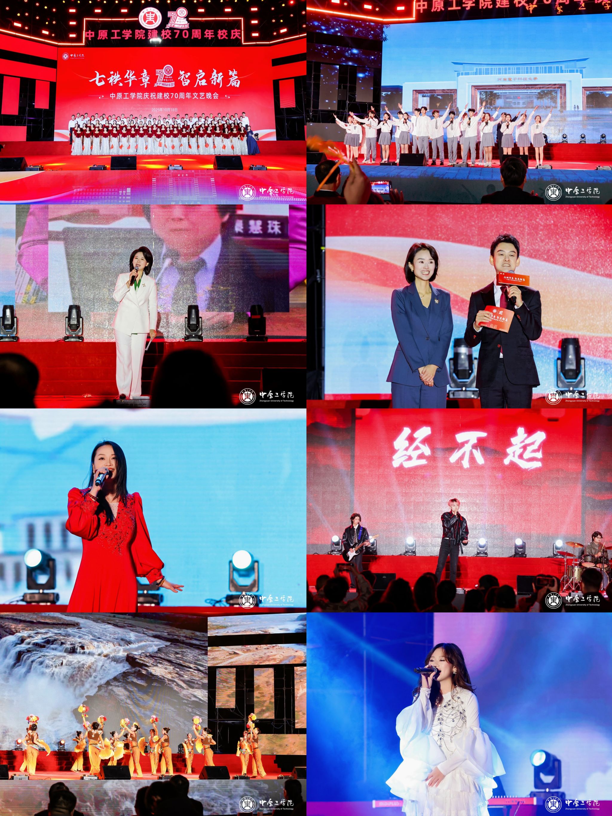 整场晚会分为“七秩华章”“智启新篇”两大篇章,融合音诗画、歌舞、情景表演、创意表演、朗诵等多种艺术形式,生动展现学校七十年砥砺奋进的发展历程与开拓未来的坚定信念。晚会由我校2004级校友、河南广播电视台主持人何君,2006级校友、香港电台普通话台主持人袁立一,2020级校友、海峡两岸主持人大赛(河南赛区)金奖获得者尤亚天,以及新闻与数字传播学院教师谢玉洁、2025级研究生景仰、2023级本科生杨孟霖共同主持。