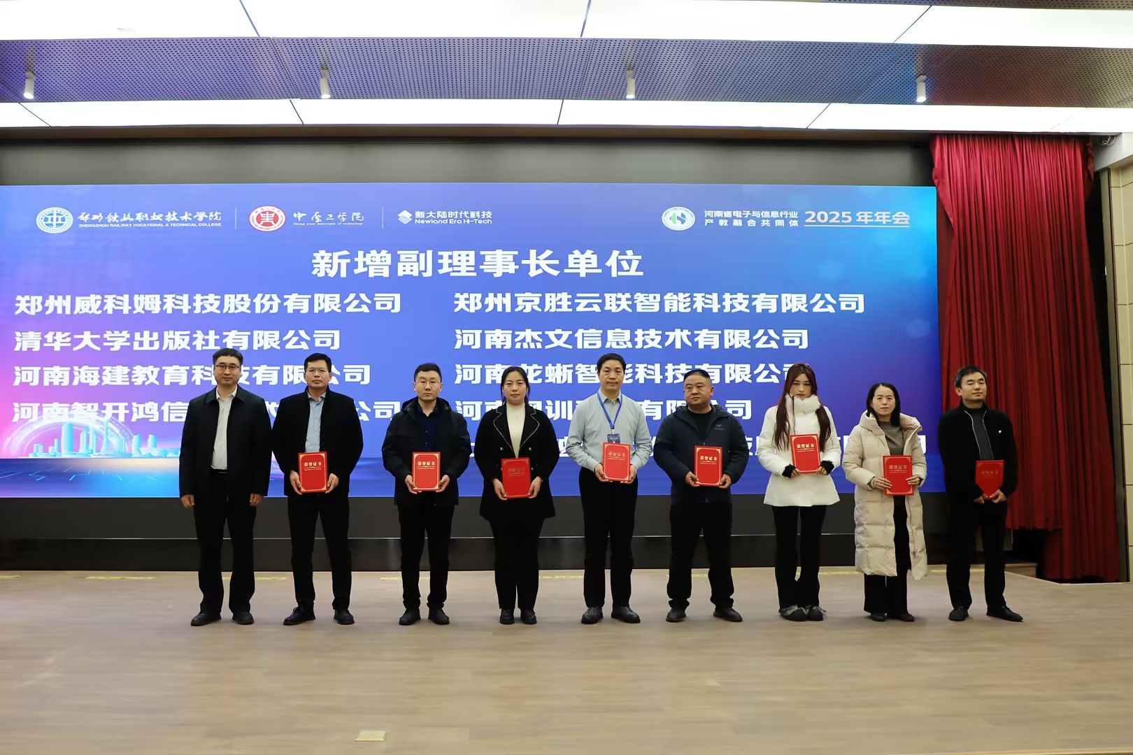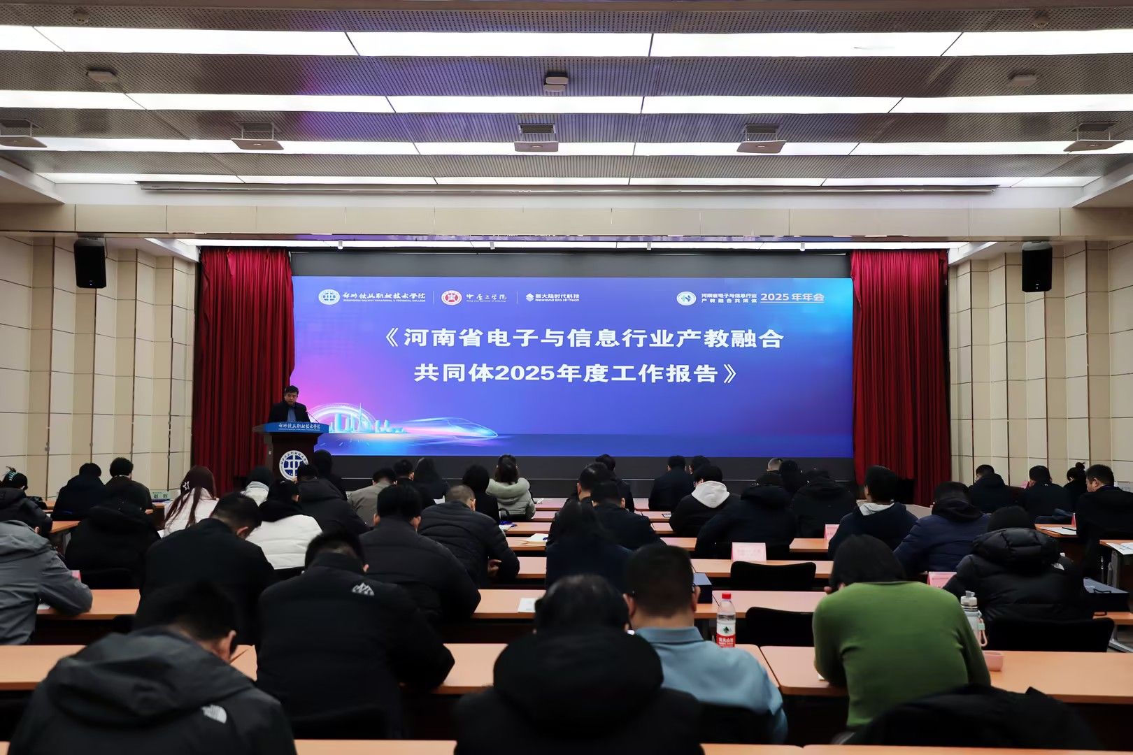 近日,河南省电子与信息行业产教融合共同体2025年年会在郑州铁路职业技术学院举行。大会主题为“智汇双高·具身赋能——共筑电子信息产教融合新生态”。我校副校长杨坤、郑州铁路职业技术学院校长李福胜、中国铁道出版社有限公司总编辑杨新阳、北京新大陆时代科技有限公司常务副总经理邓立、河南省无人机协会会长曹胜利出席会议,100余位企业、高等院校、行业协会和科研机构代表参加会议。
