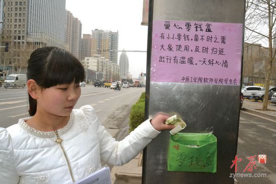“小小零钱盒能树立我们城市的文明形象,也能检验市民的诚信度。”该学院学工办主任王冰说。