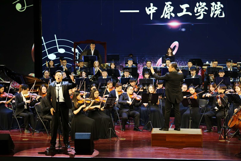音乐会在民族管弦乐《狮城序曲》中拉开序幕。音乐家们的精致演奏,独具特色的指挥,惟妙惟肖的音乐效果,迅速吸引了在场师生,并将他们领入音乐的世界。郑州大学音乐学院管弦乐团和交响乐团先后演奏了《红楼梦序曲》、靺鞨组曲第一乐章《武士》《丝绸之路》《热巴舞曲》《火祭舞》《浪漫曲》《龙骑兵序曲》《北京喜讯到边塞》等经典曲目,节奏灵活多变,合奏气势宏大,多次将现场气氛推向高潮。