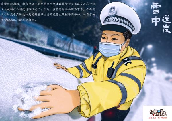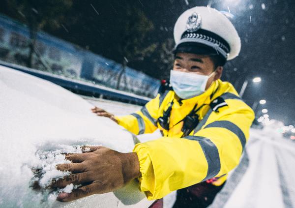 (雪花纷纷扬扬飘落下来,在新密北站防疫卡点附近执勤的新密市公安局交警大队辅警周伟伟,站在雪地里帮助原地打滑车辆推车)
