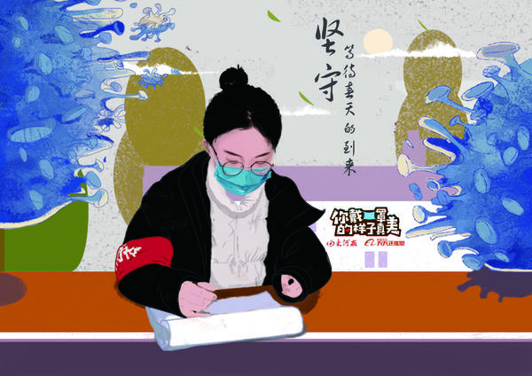 “我的两幅作品均采用了扁平风插画的艺术风格,将前线抗疫人员生动可爱的形象描绘出来。”何国藩同学说。