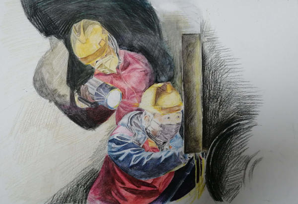 “现在能够助力艺术创作的软件有很多,有些人便觉得进行艺术二次创作并不是难事,分分钟就能搞定,其实并不是这样的。”刘雅菲同学说,“我在创作自己的两幅‘口罩英雄’作品时,力求点、线、描的每一笔,都认真对待,饱含敬意!”