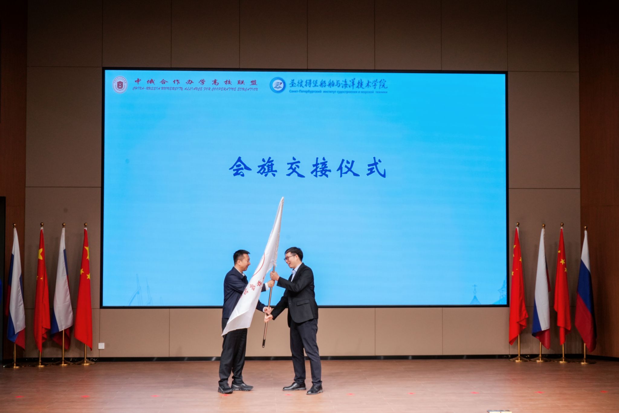 会议期间召开了中俄合作办学高校联盟常务理事会,决定由我校担任2025—2026年度轮值主席单位。在会旗交接仪式上,渭南师范学院校长李强将轮值主席单位会旗移交至温盛军手中。温盛军作表态发言时表示,我校将在联盟指导下,与各成员高校携手深化合作,共同推动中俄合作办学与人文交流迈向更高水平。